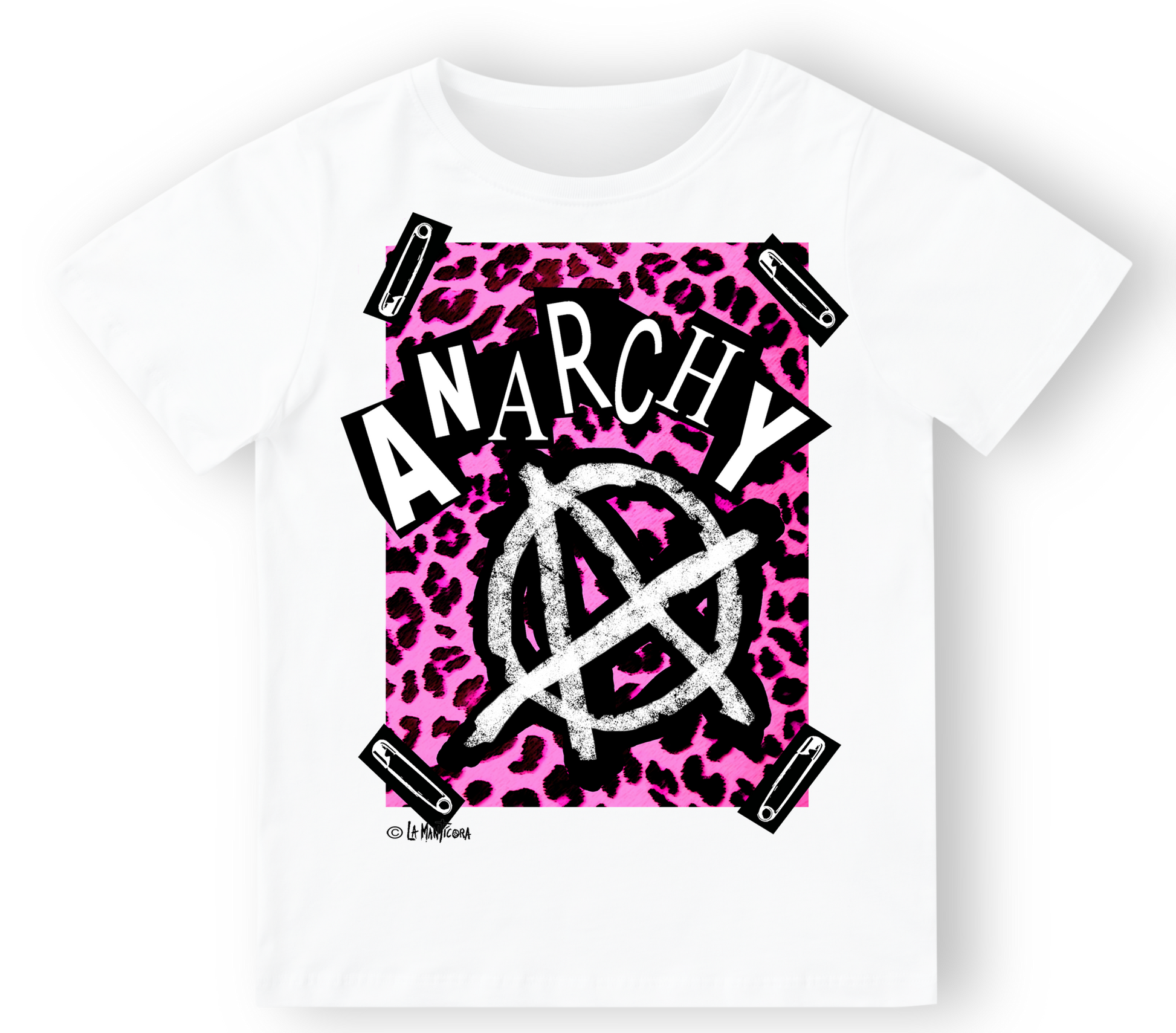 Camiseta Manga Corta 100 % algodón en color blanco. Modelo Anarquia en tonos rosas sobre camiseta blanca