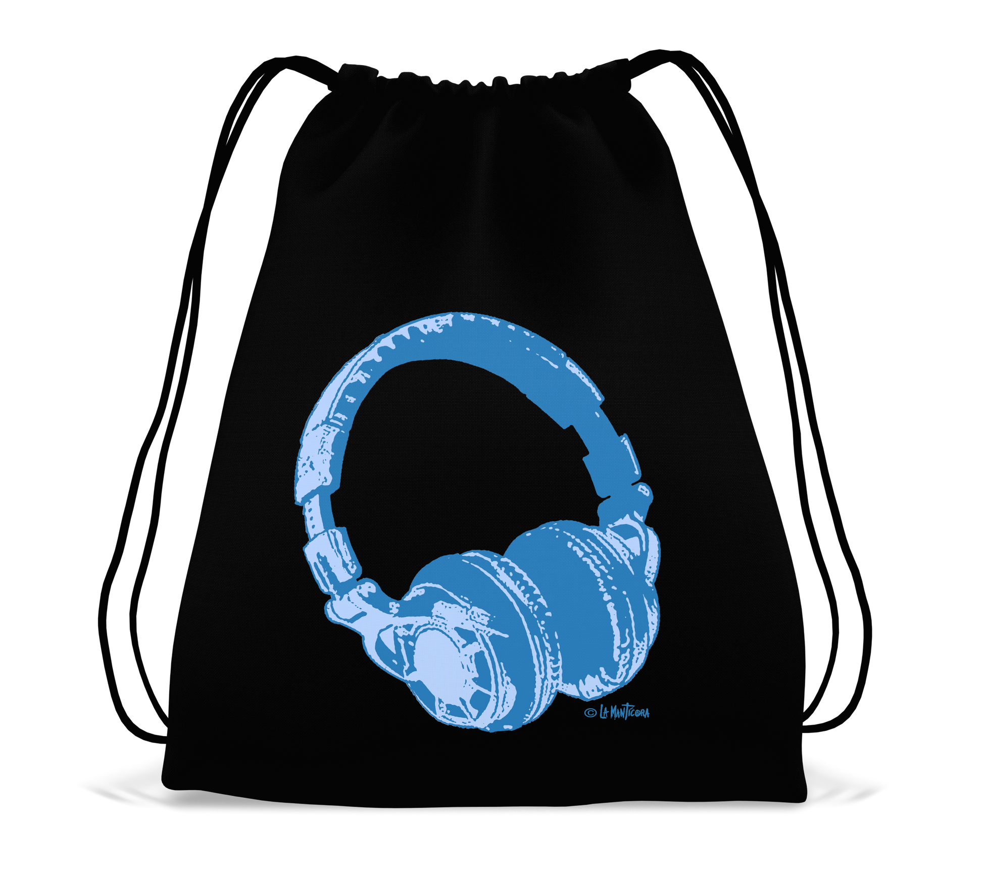 Bolsa 100 % algodon 200 gr. Cierre con cordón ajustable. Auriculares azules