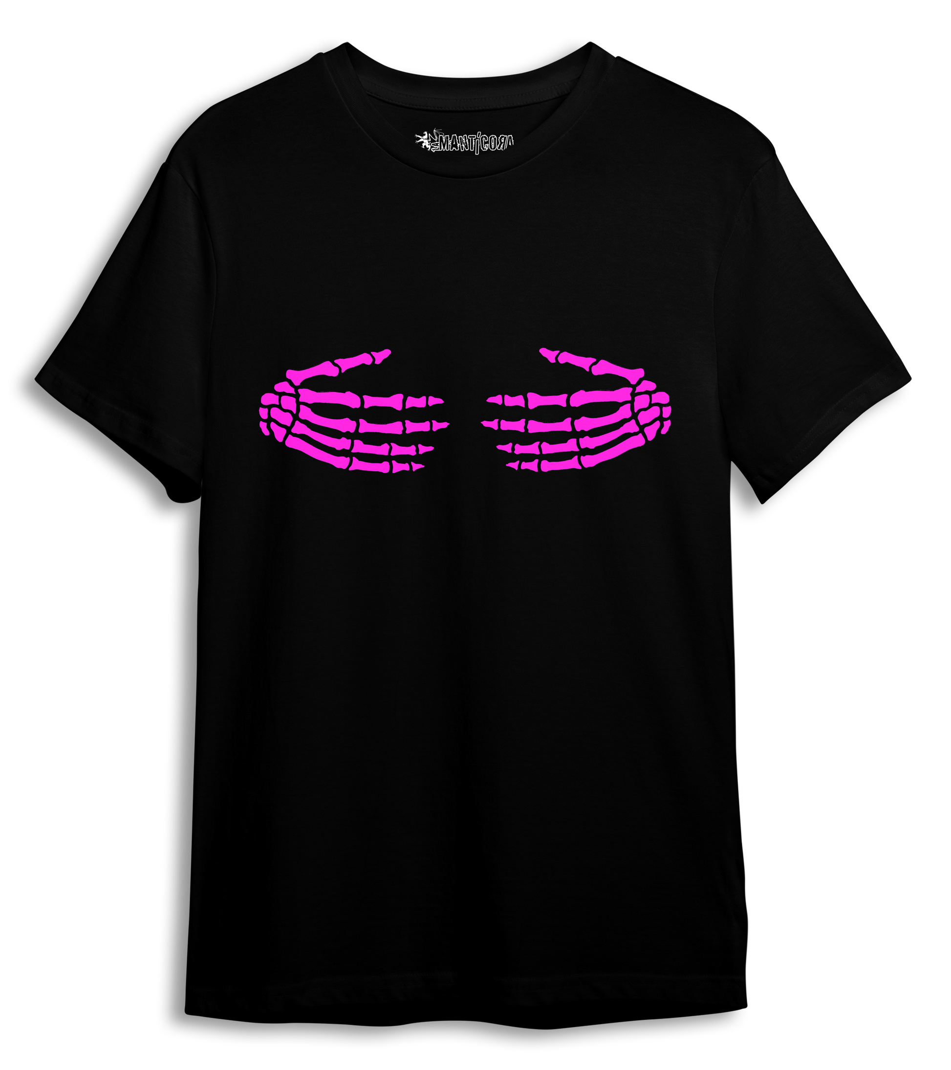 Camiseta Manga Corta 100 % algodón en color negro. Diseño Abrazo huesudo fucsia sobre camiseta negra