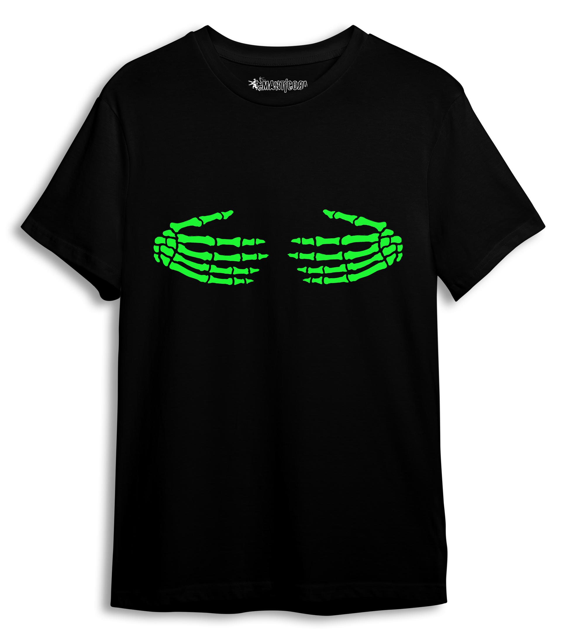 Camiseta Manga Corta 100 % algodón en color negro. Diseño Abrazo huesudo verde sobre camiseta negra.