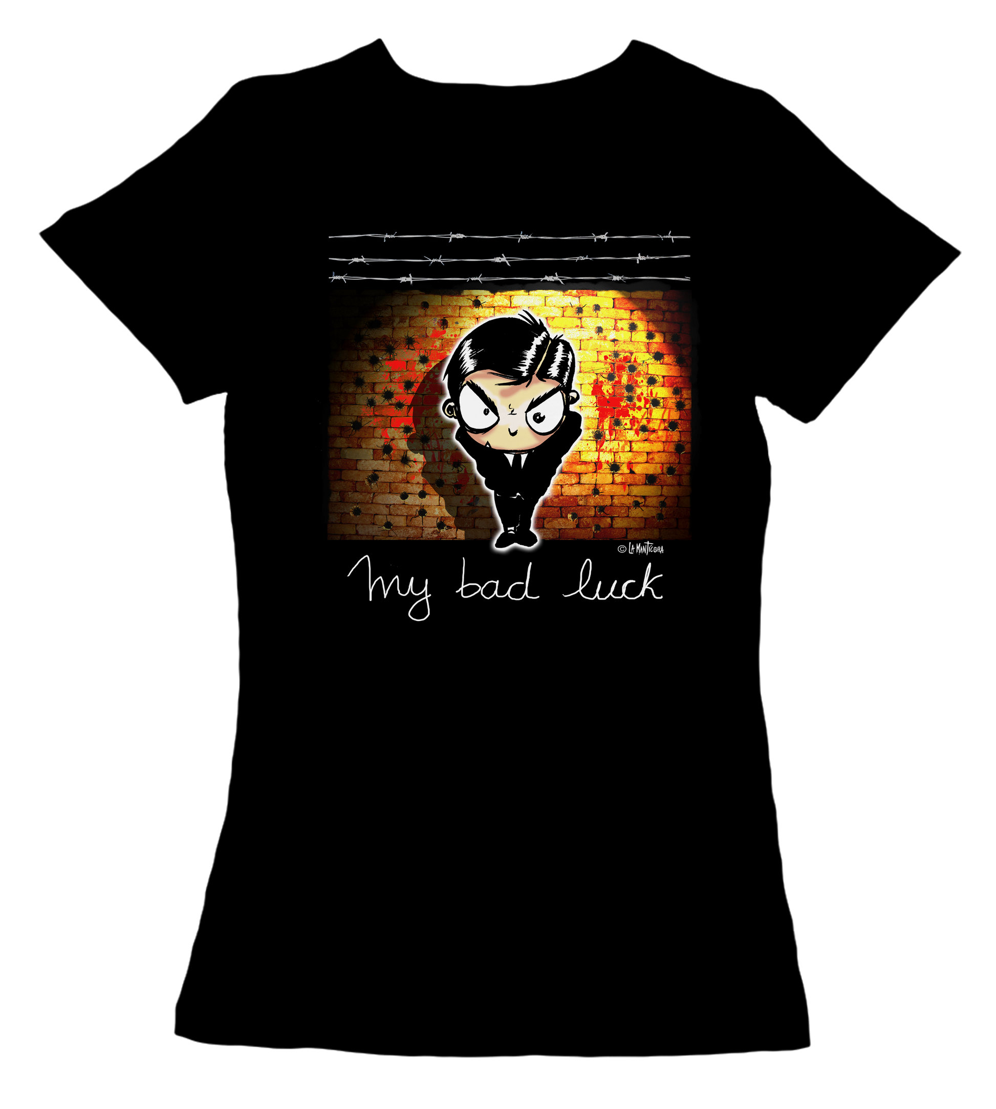 Camiseta Manga Corta 100 % algodón entallada en color negro. Diseño My Bad lucky. Personaje del comic Infernal Kids. Comic que pronto podréis disfrutar!