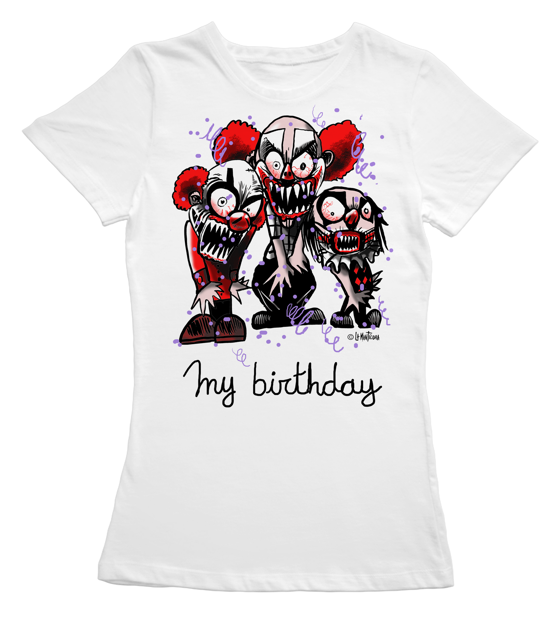 Camiseta Manga Corta 100 % algodón entallada en color blanco. Diseño My Birhtday. Personaje del comic Infernal Kids. Comic que pronto podréis disfrutar!