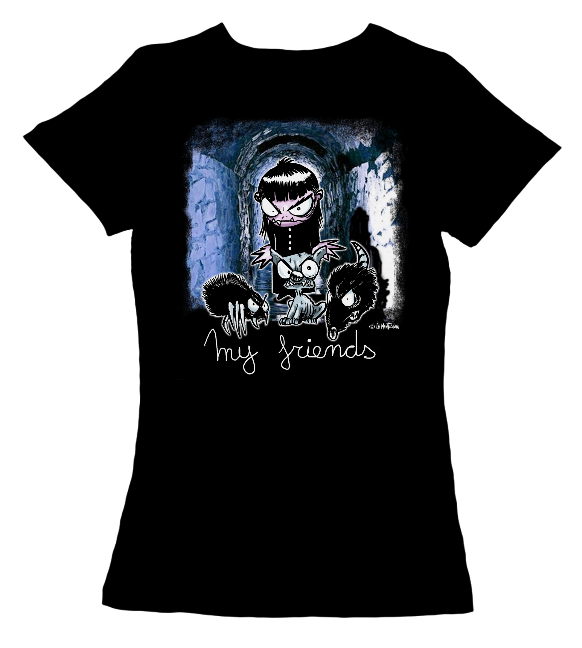 Camiseta Manga Corta 100 % algodón entallada en color negro. Diseño My Friends. Personaje del comic Infernal Kids. Comic que pronto podréis disfrutar!