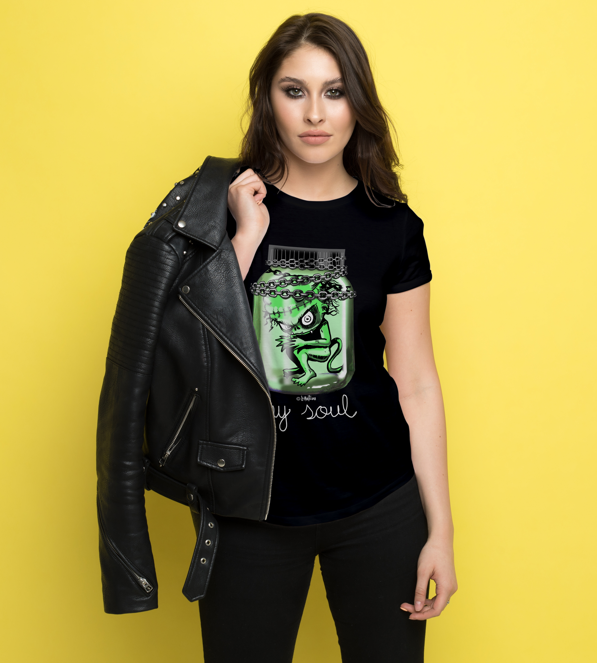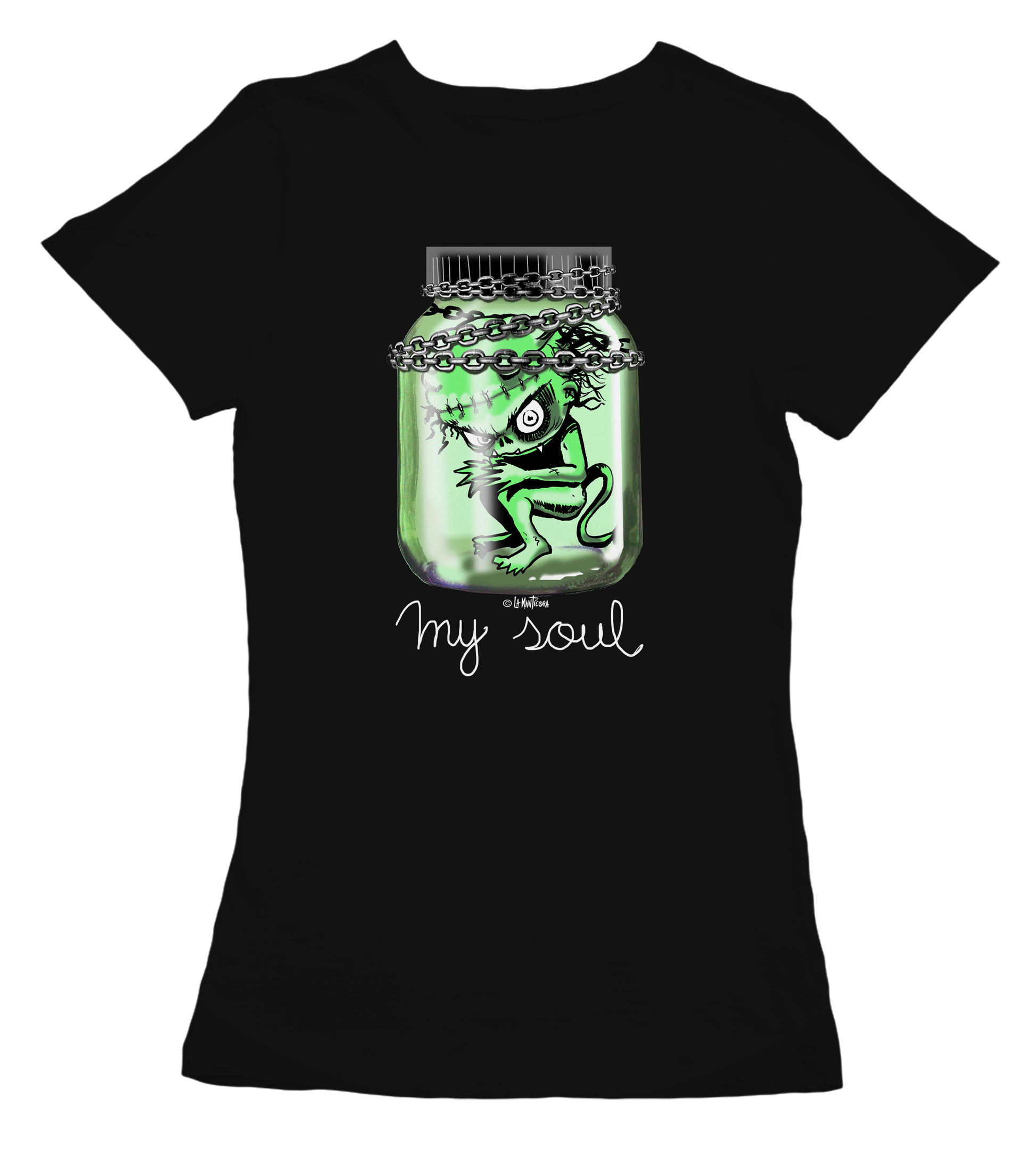 Camiseta Manga Corta 100 % algodón entallada en color negro. Diseño My Soul. Personaje del comic Infernal Kids. Comic que pronto podréis disfrutar!