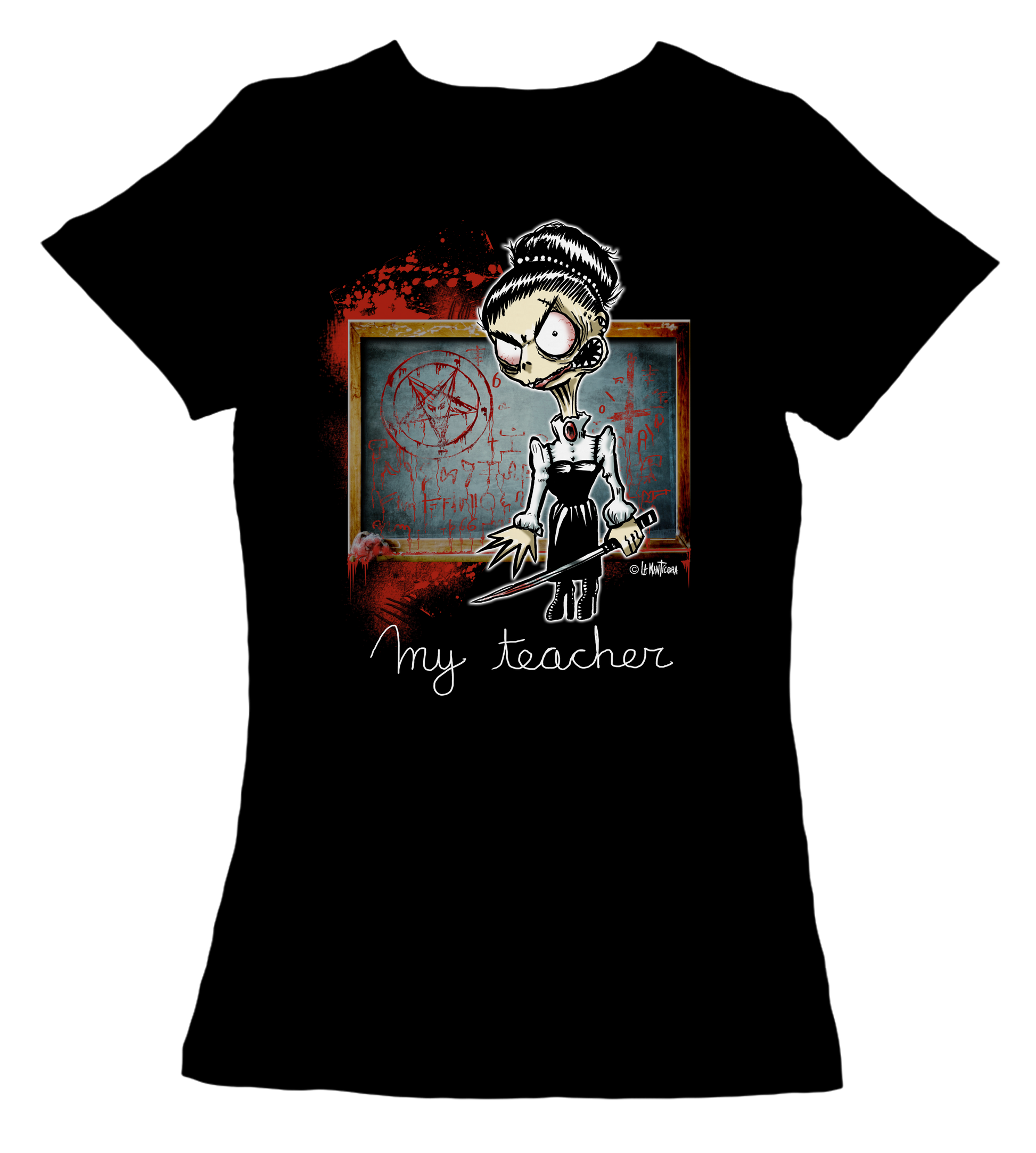 Camiseta Manga Corta 100 % algodón entallada en color negro. Diseño My Teacher. Personaje del comic Infernal Kids. Comic que pronto podréis disfrutar!