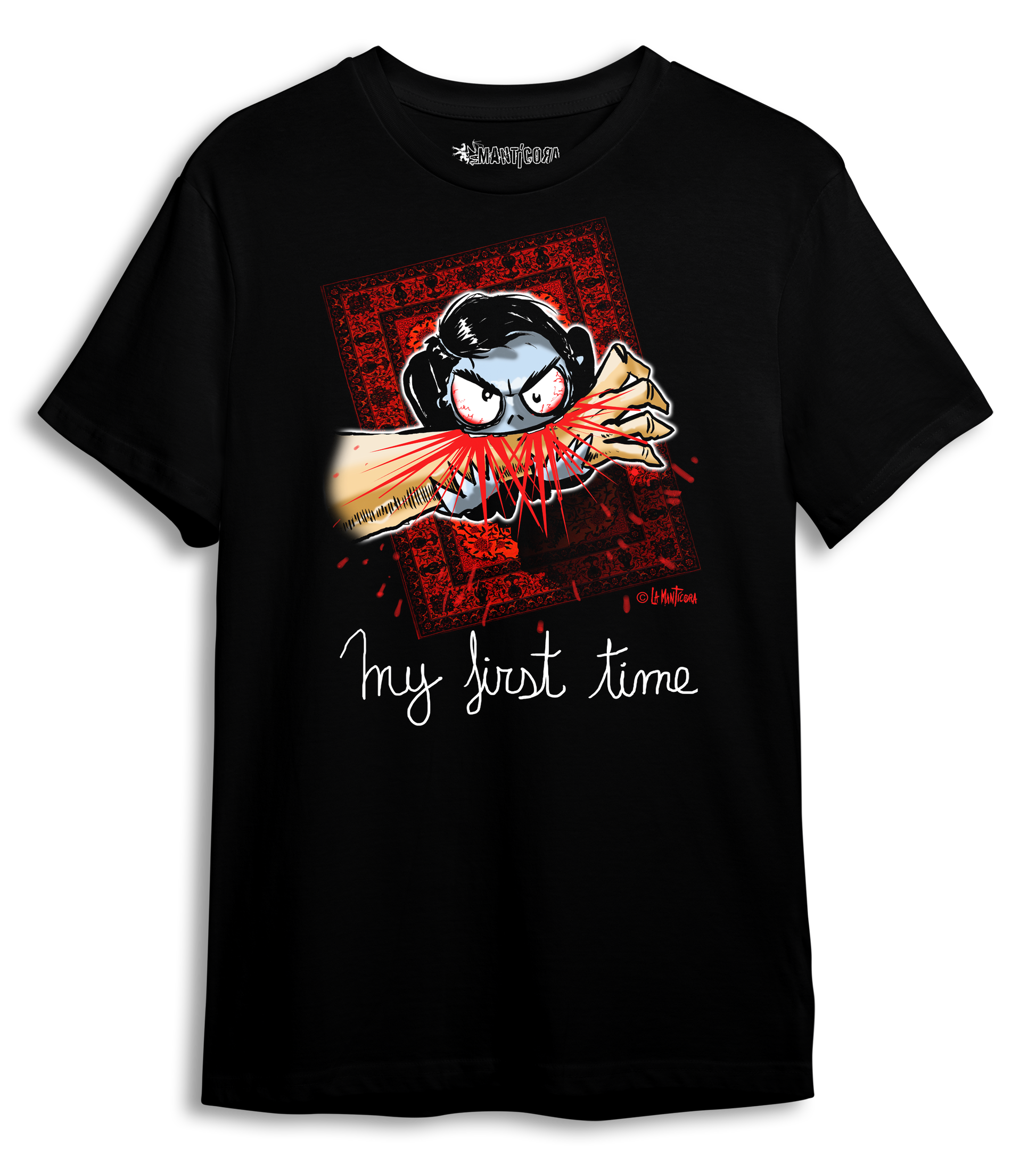 Camiseta Manga Corta 100 % algodón en color negro. Diseño My First Time. Personaje del comic Inferna Kids. Comic que pronto podréis disfrutar!