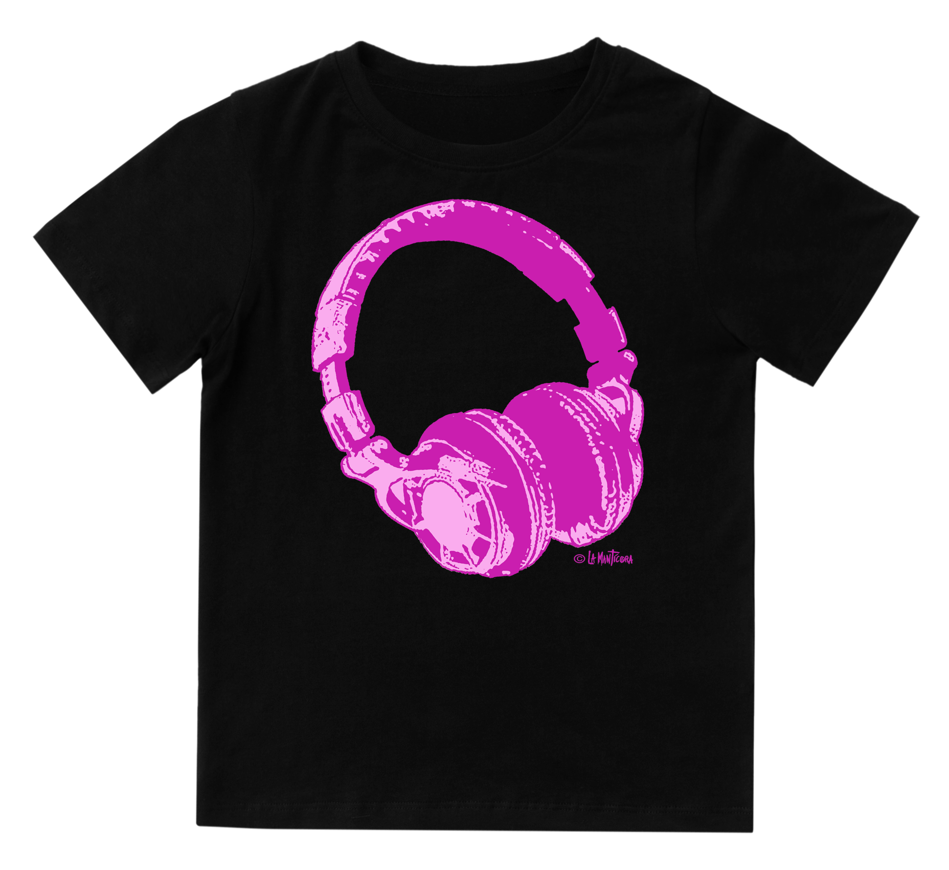 Camiseta Manga Corta 100 % algodón en color negro. Modelo Auriculares en tonos rosas sobre camiseta negra
