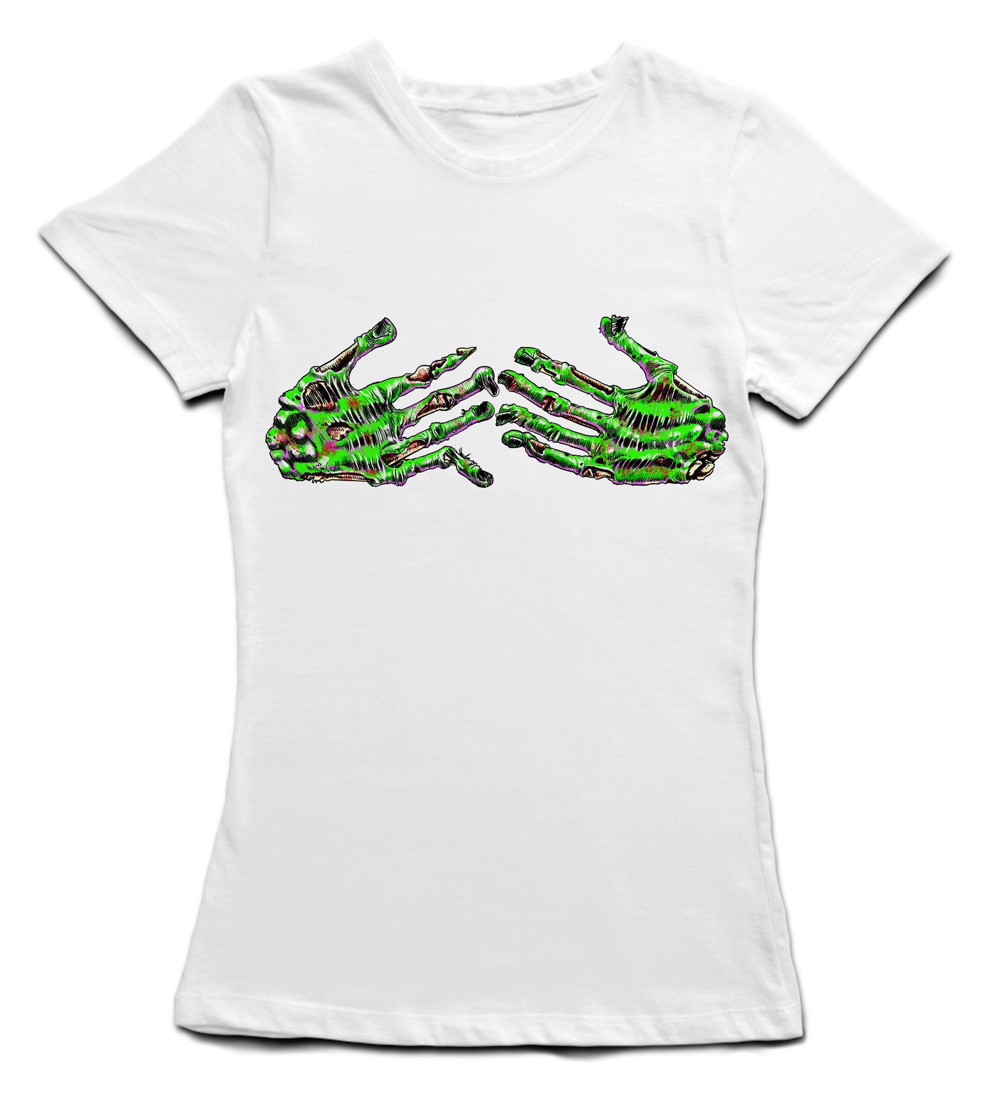 Camiseta Manga Corta 100 % algodón en color negro. Diseño Abrazo Zombie en camiseta blanca.