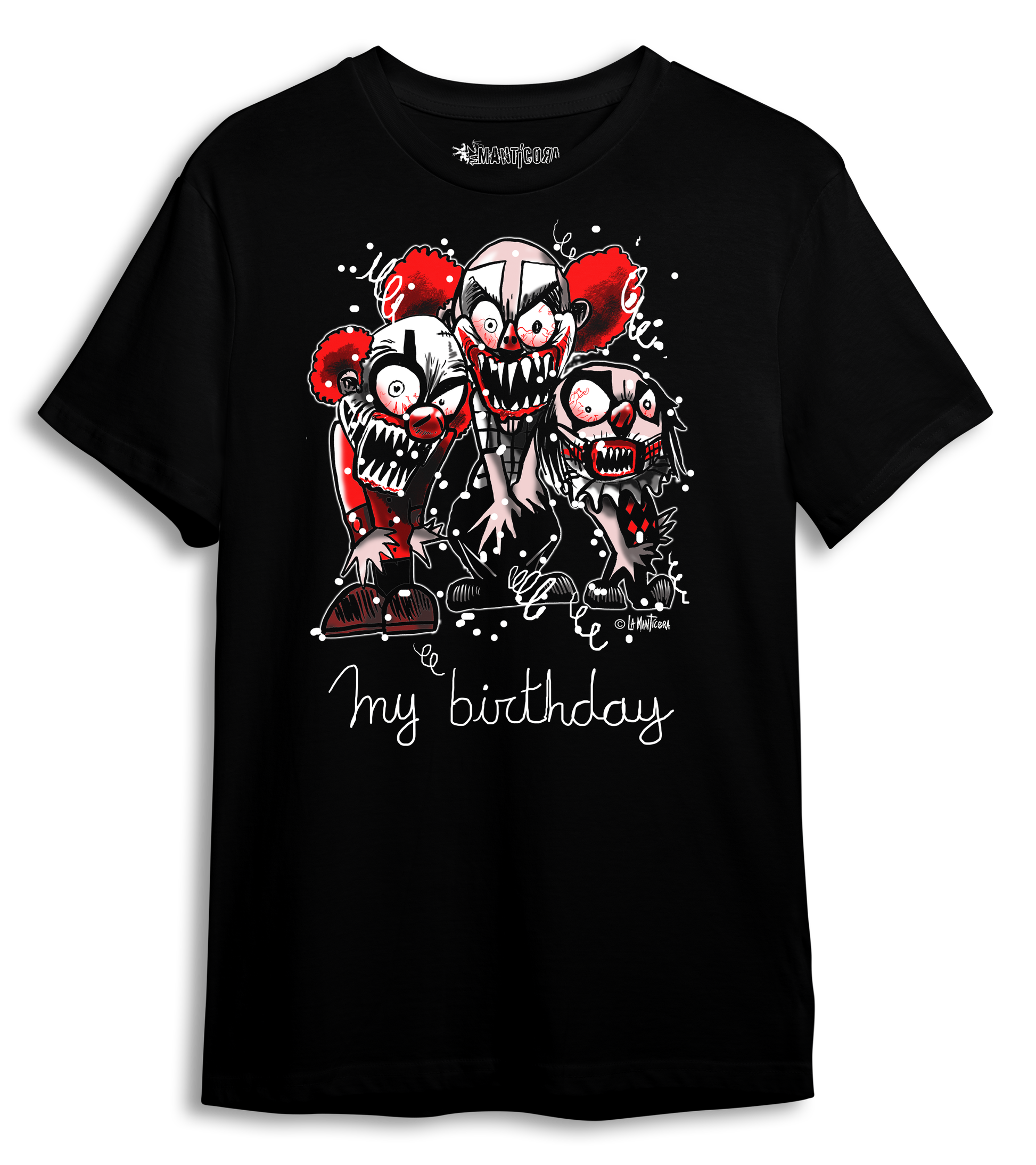 Camiseta Manga Corta 100 % algodón en color negro. Diseño My Birthday. Personaje del comic Inferna Kids. Comic que pronto podréis disfrutar!
