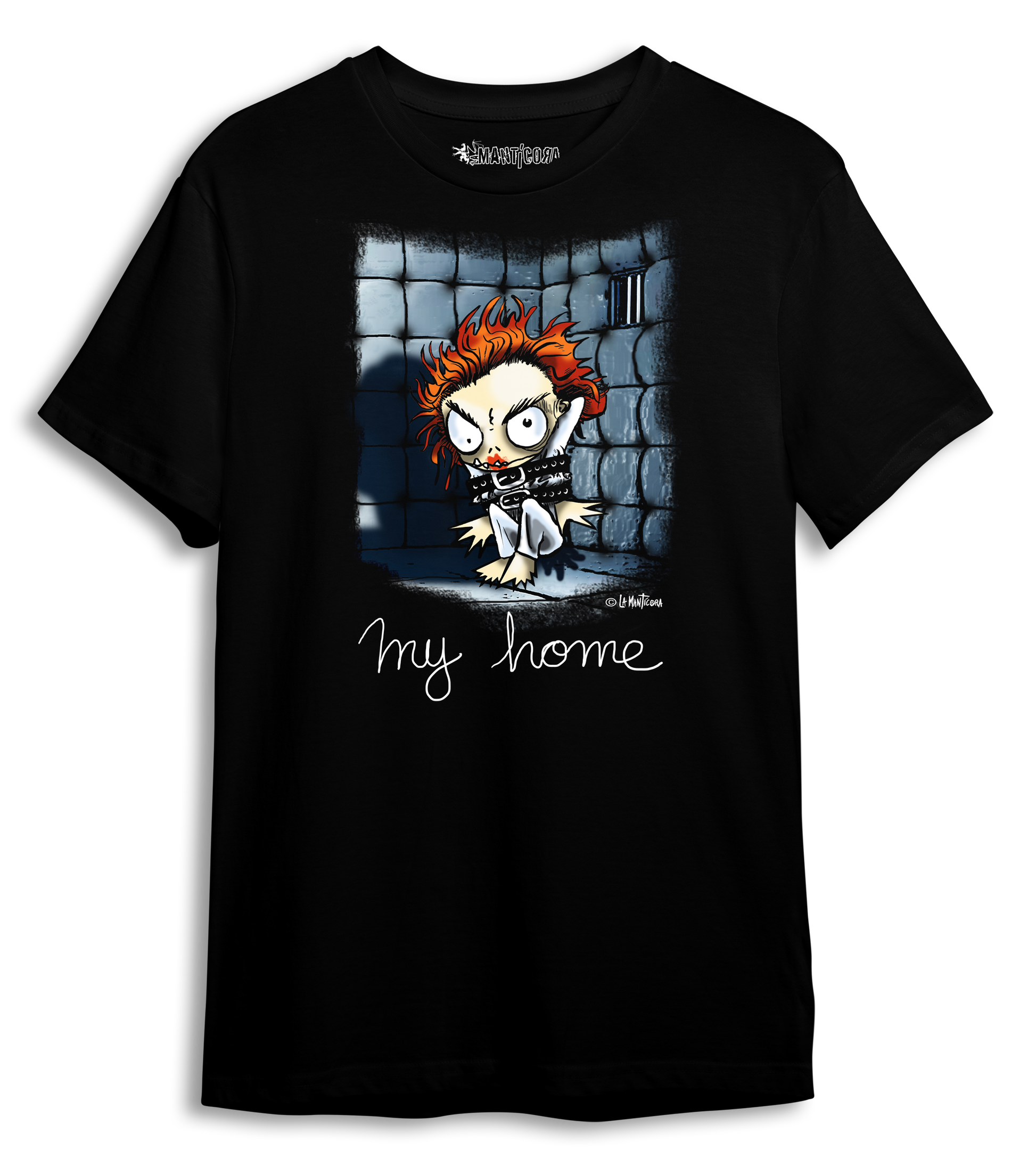 Camiseta Manga Corta 100 % algodón en color negro. Diseño My Home. Personaje del comic Inferna Kids. Comic que pronto podréis disfrutar!
